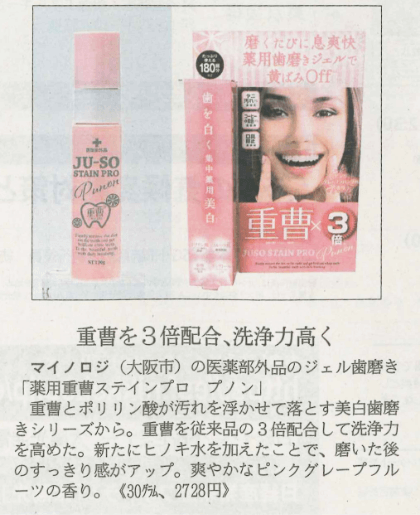 重曹配合の薬用美白歯磨きシリーズからピンクグレープフルーツの香り付きの歯磨きジェルが発売。従来品よりも重曹が3倍配合され、洗浄力が高くなり歯磨き後の爽快感もUP。
